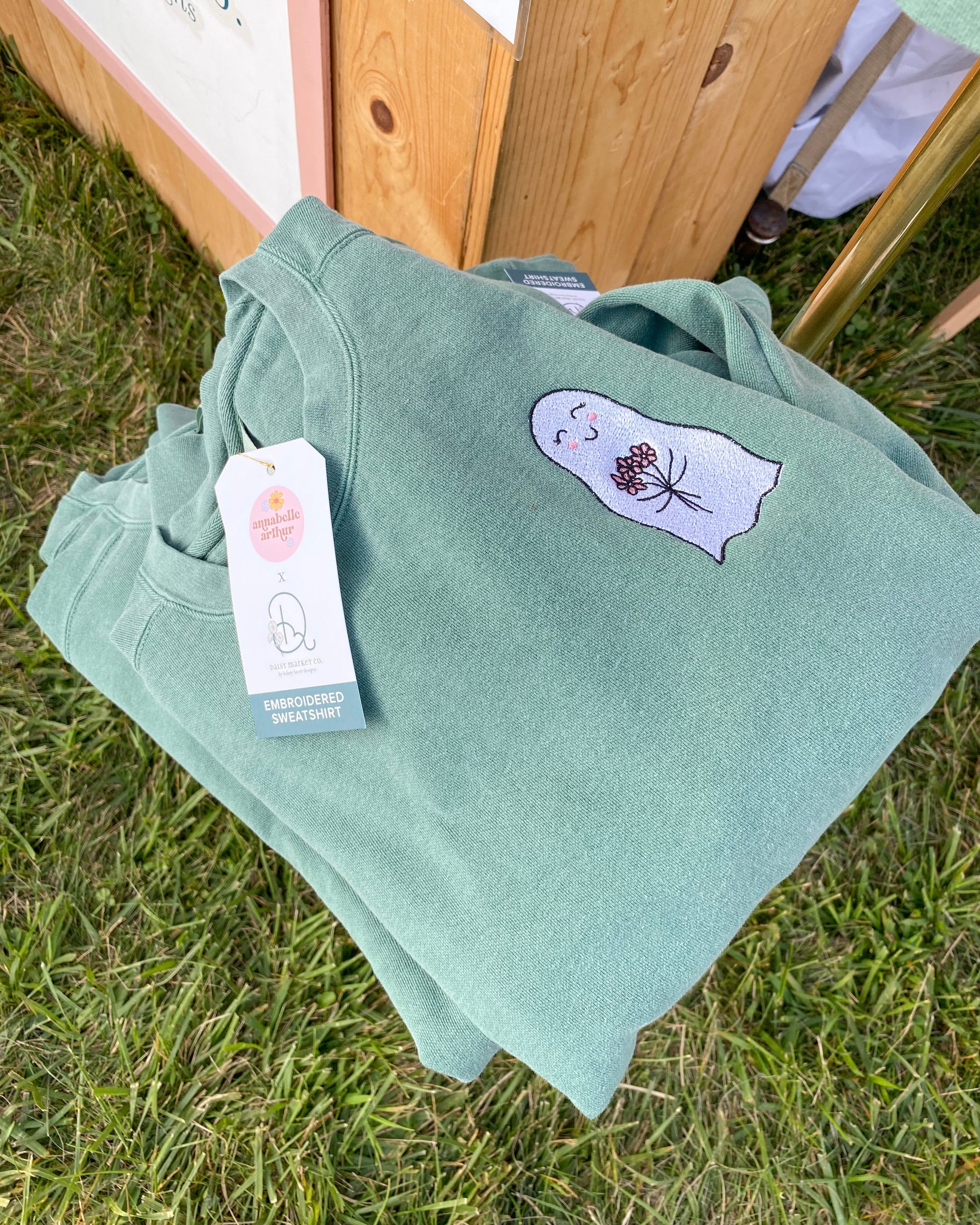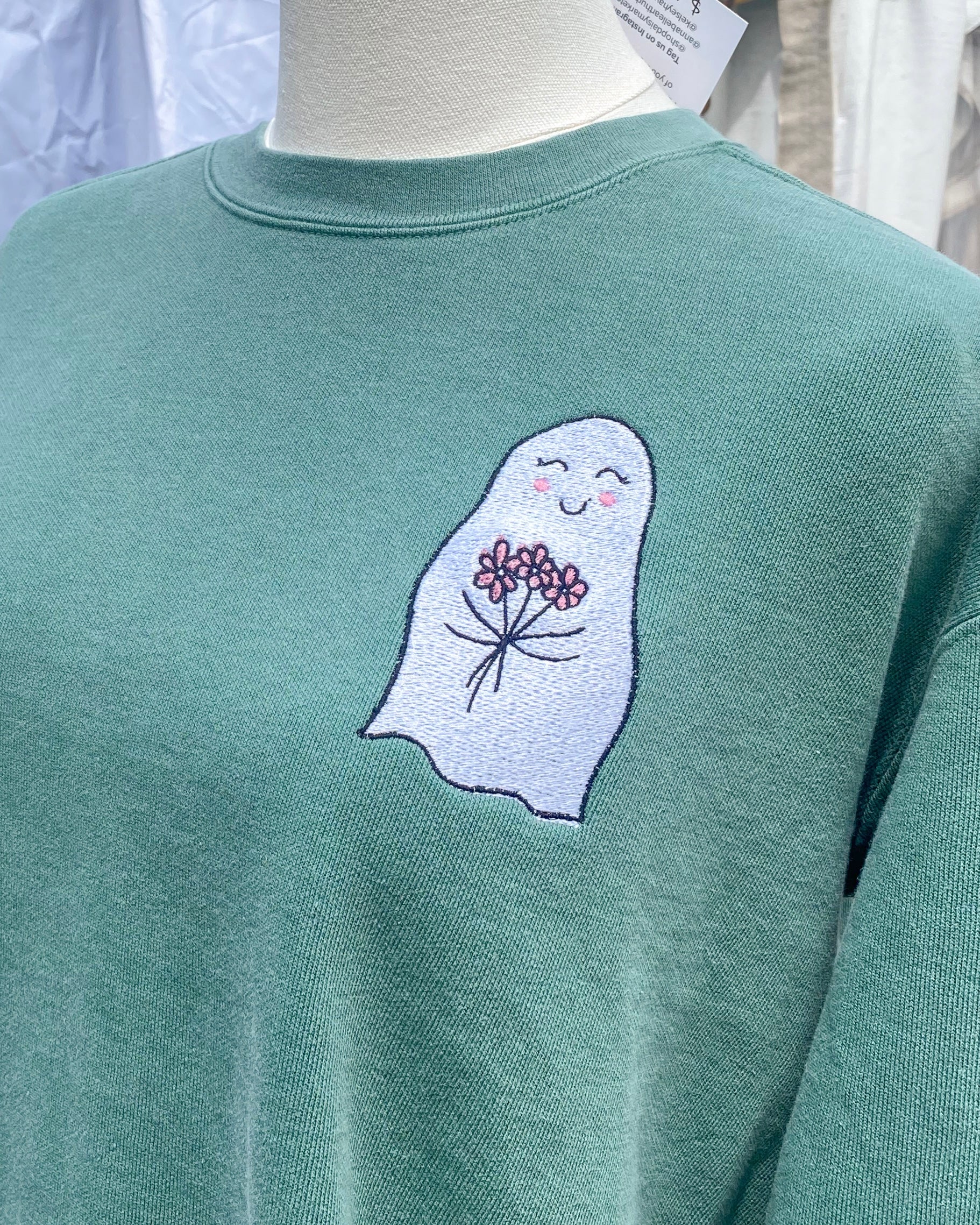 The floral ghost is back and on a higher quality, Comfort Colors sweatshirt and the embroidery was done by Ashley of Annabelle Arthur Boutique. The crewneck is a beautiful green color with the ghost holding flowers.