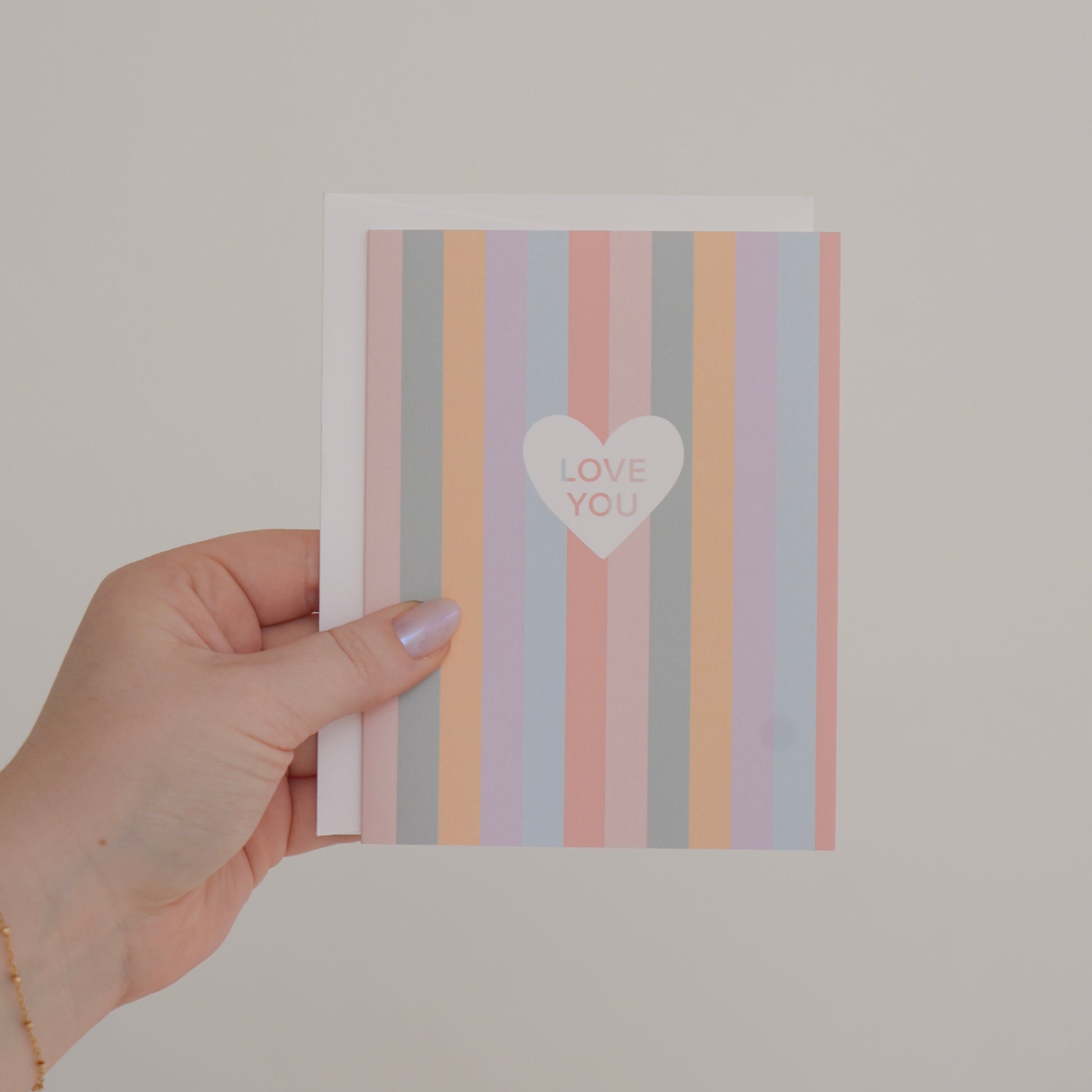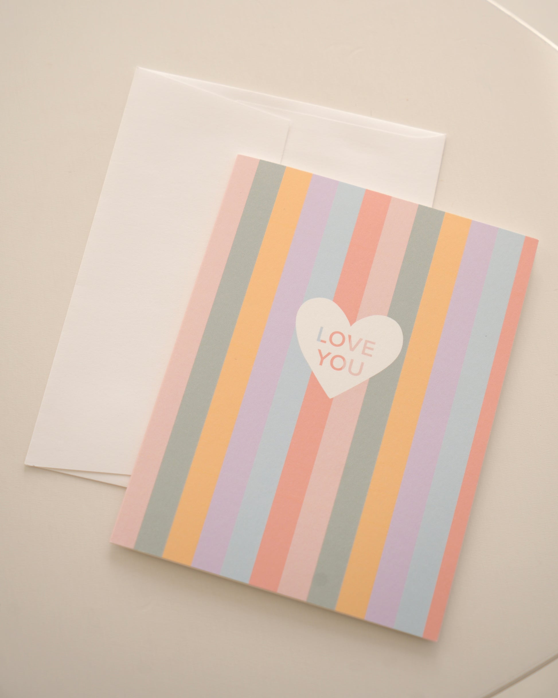 A simple striped card that says it all. It measures 4.25x5.5” when folded and comes with a white envelope. These are printed on sturdy 110 Smooth Ultra White paper. It is blank on the inside so you can write a personalized note to that special recipient!