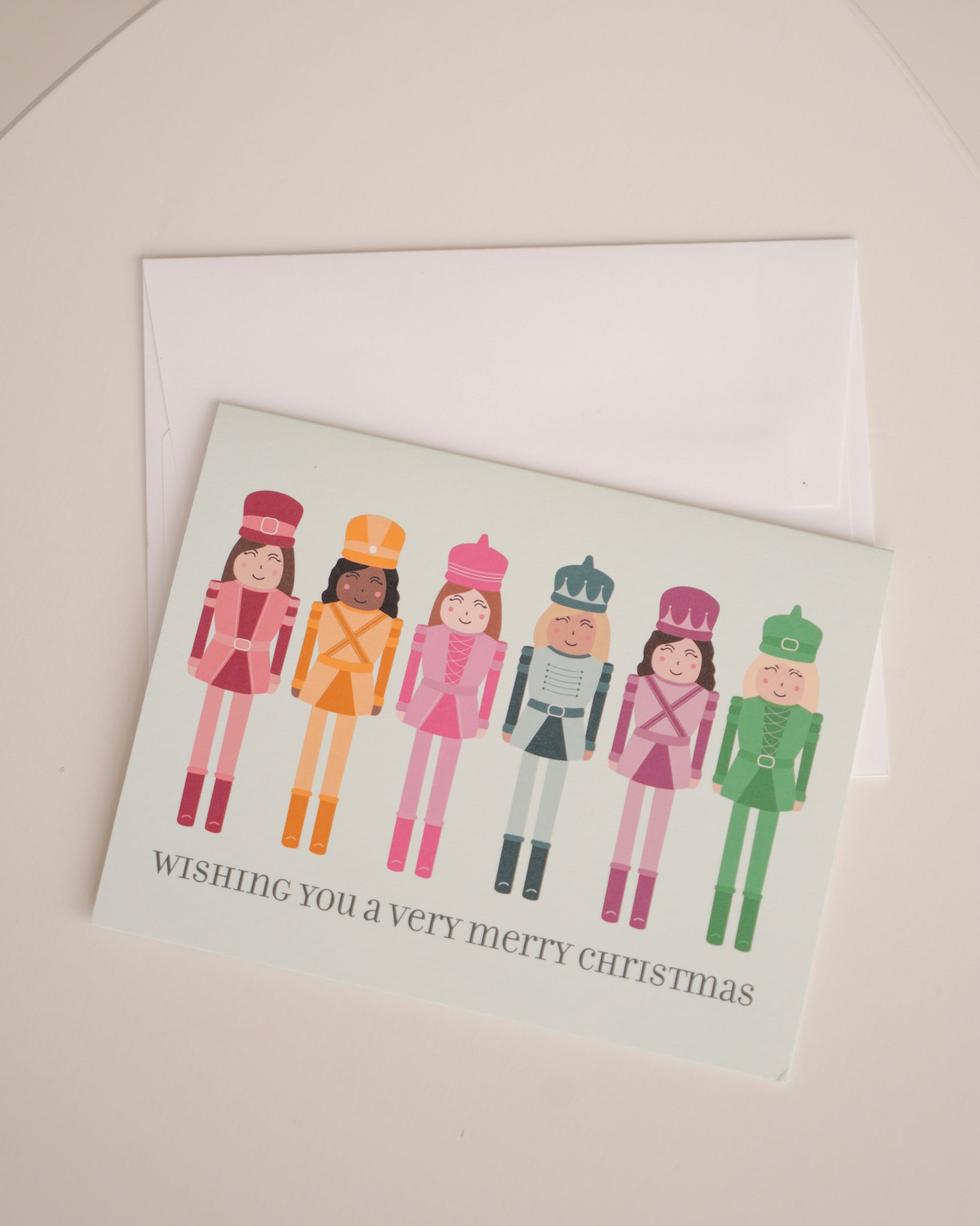 Send off some Christmas wishes with these colorful, female nutcrackers! The card is blank on the inside so you can write your personalized messages and send it off with the included white envelope. Measures 4.25x5.5 when folded and printed on sturdy 110 Smooth Ultra White paper.