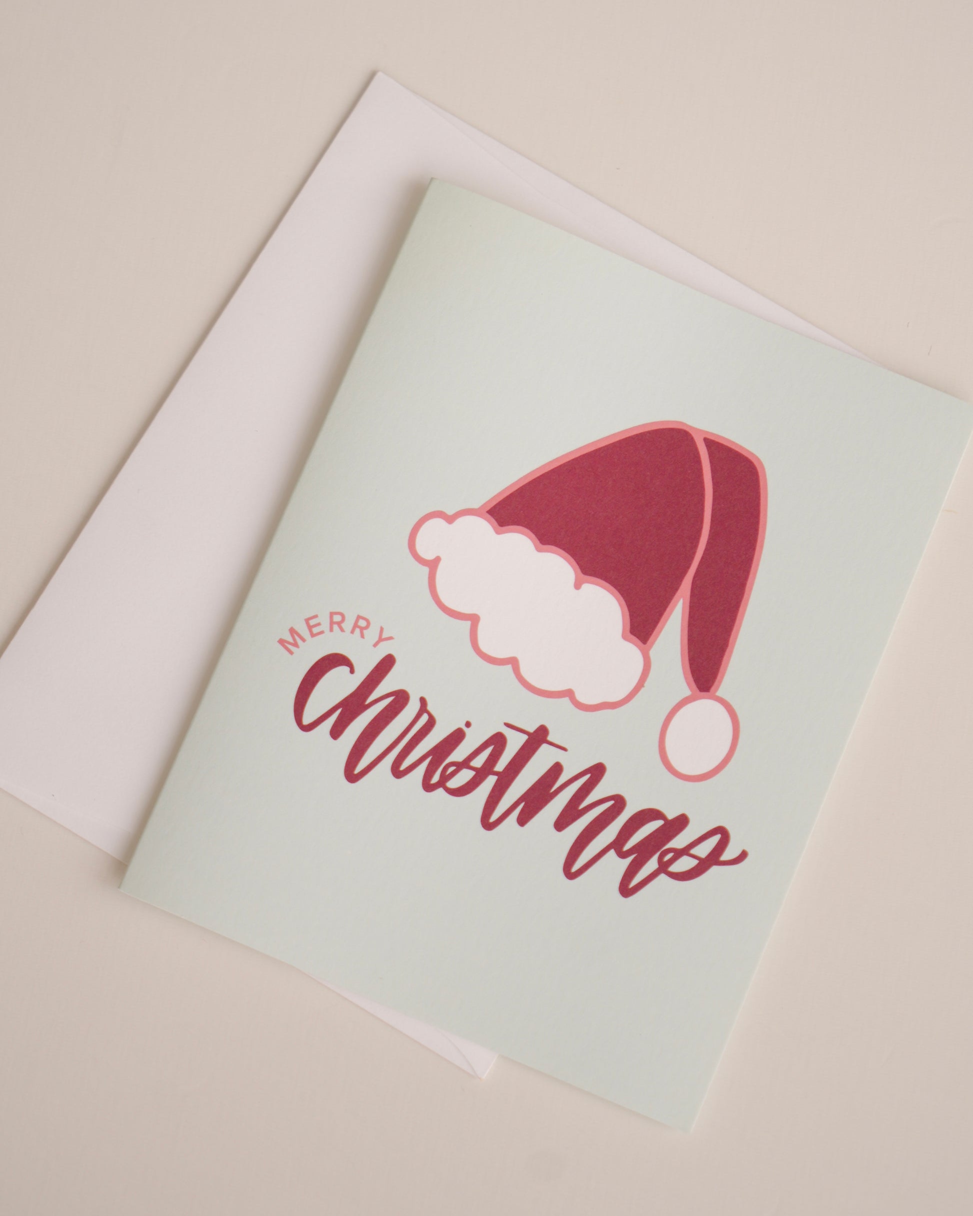 A holly jolly card featuring Santa's hat. It measures 4.25x5.5” when folded and comes with a white envelope. These are printed on sturdy 110 Smooth Ultra White paper. It is blank on the inside so you can write a personalized note to the recipient!