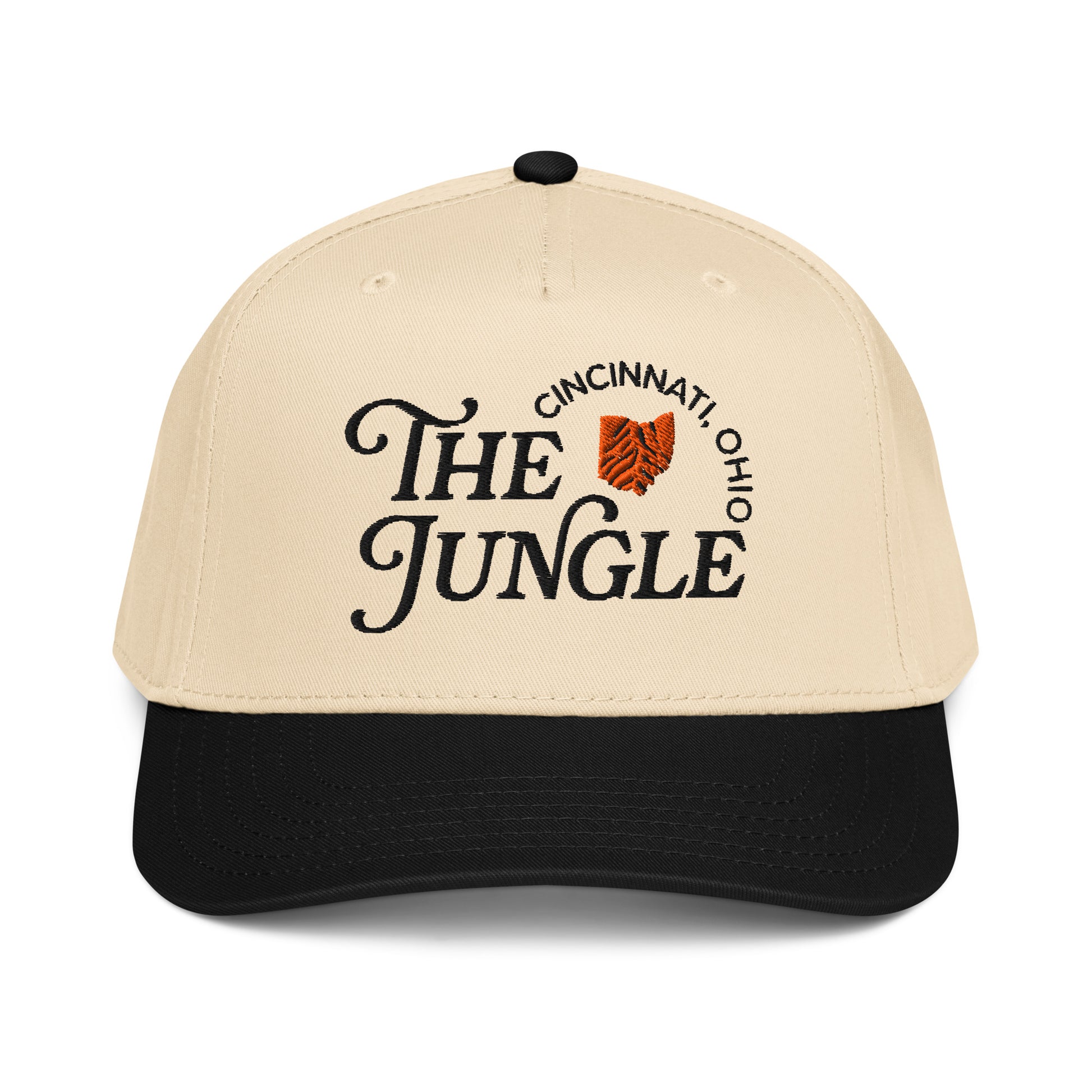 A game dey embroidered hat that features an original Cincy Jungle design. The hat is an Otto Five Panel Mid-Profile Baseball Cap with a canvas body and a black bill. The back has an embroidered state of Ohio above the adjustable snap closure.